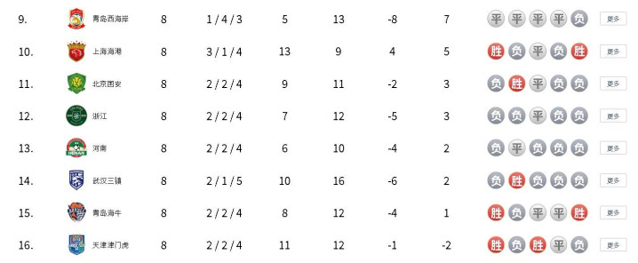 保级大战从第1轮就开始厮杀了。8轮过后,从第12名到第16名只差3分。每一轮的结果,都可能改写积分榜下半区的排名。